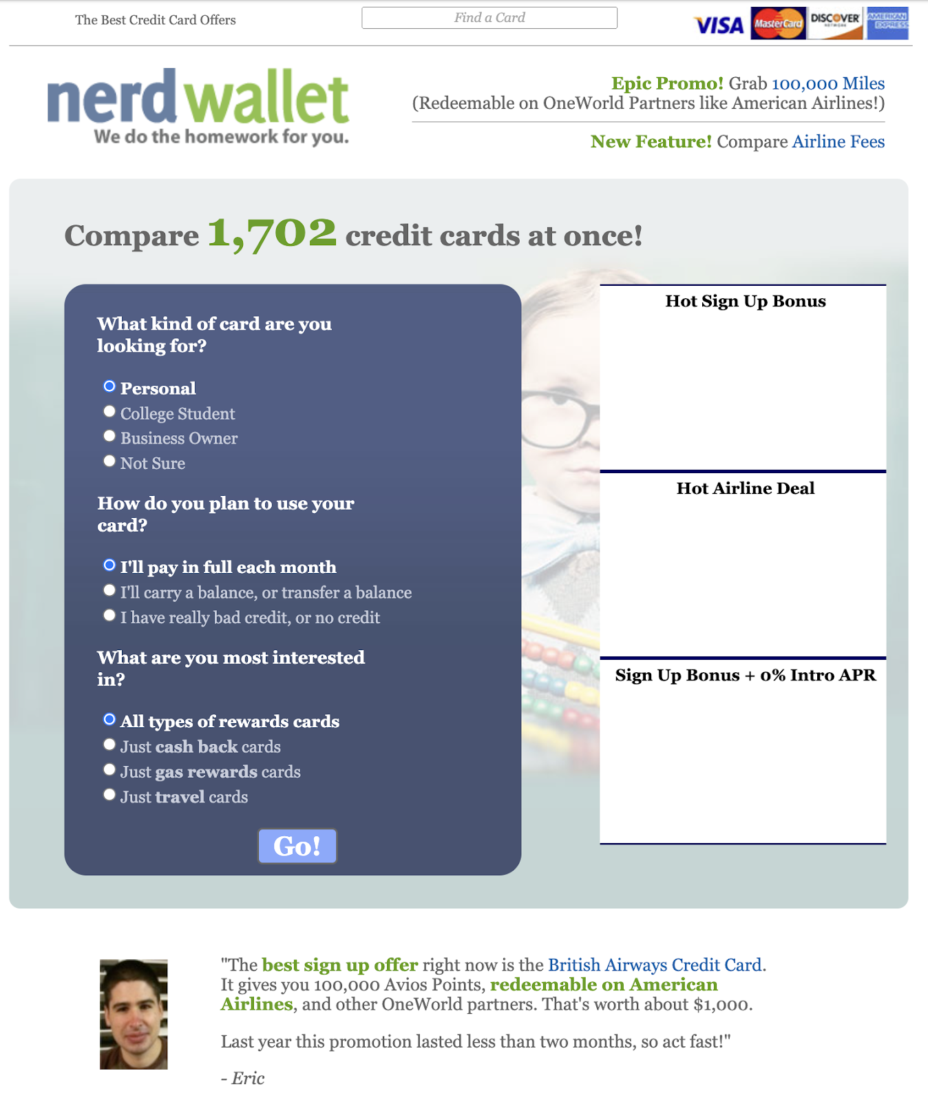 The original idea for NerdWallet was something like “Kayak for credit cards” (please withhold judgment, this was a long time ago). And while that product still somewhat exists within NerdWallet, we learned quickly that what we really needed to build was a marketing machine. Financial products run on advertising, it’s not necessarily the best product that wins, and “if you build it, they won’t come.” So we started to think of our product solely as an extension of our marketing, and we built the entire business around that instead.